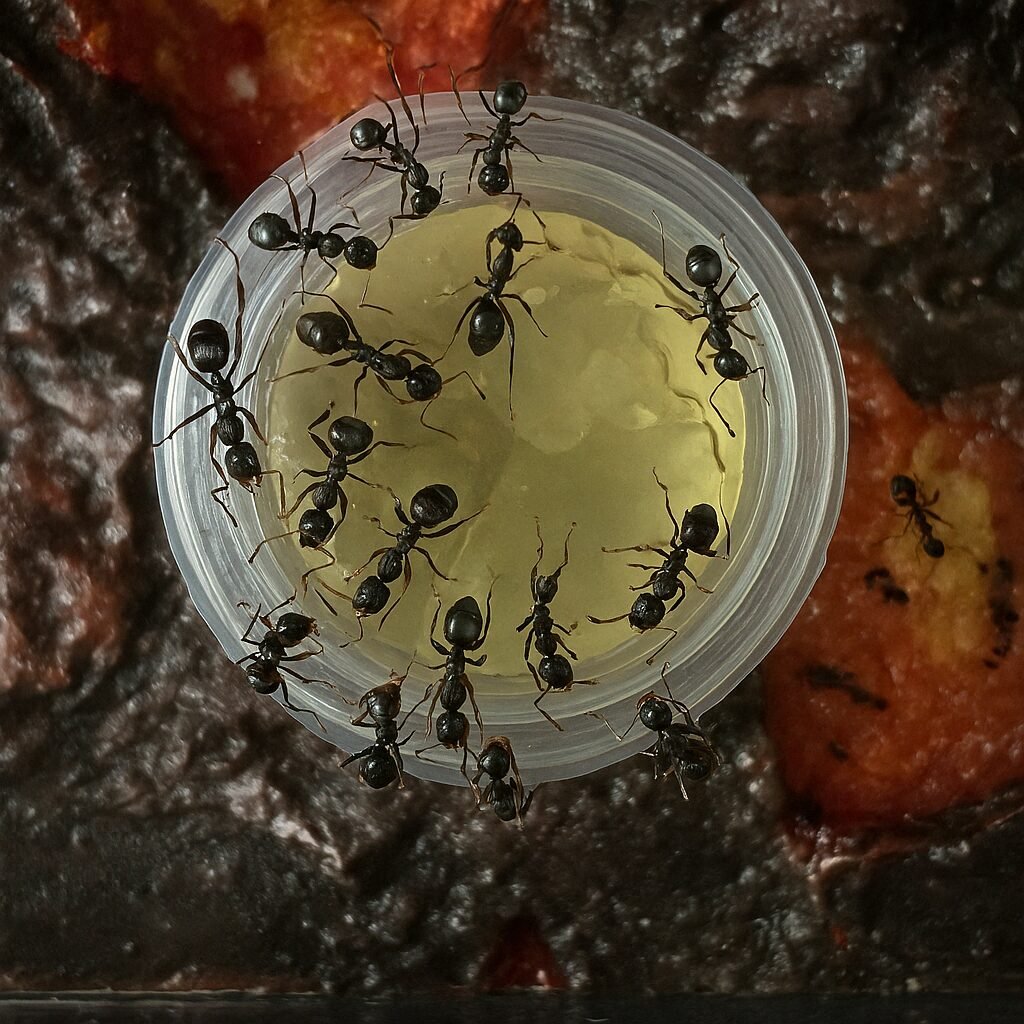 Pour nourrir tes fourmis, il suffit de prélever un petit morceau de gelée. Tu peux le déposer dans une petite gamelle placée dans l’aire de chasse. Si ta colonie est encore en tube, tu peux aussi poser un petit morceau de gelée sur un bout de papier aluminium et le placer directement dans le tube. La quantité se règle facilement en fonction de la taille de la colonie.