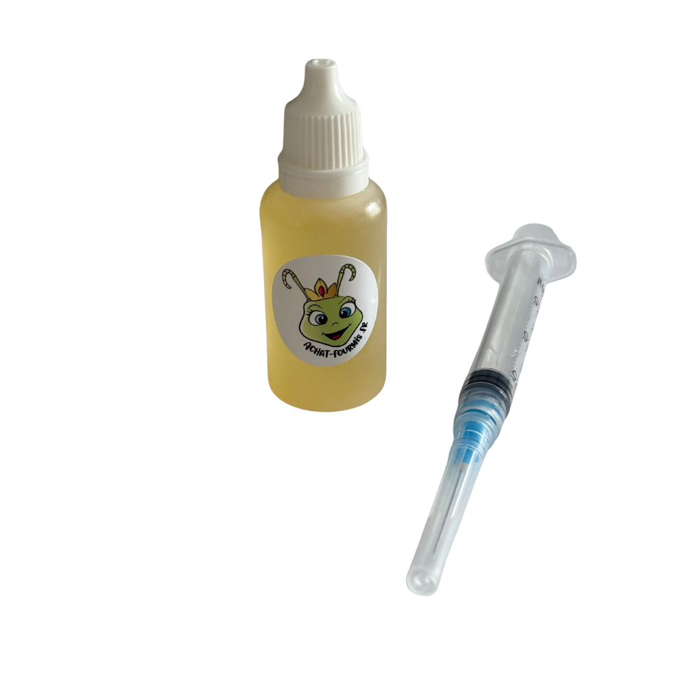 Une seringue offerte, idéale pour nourrir les fourmis directement en tube.